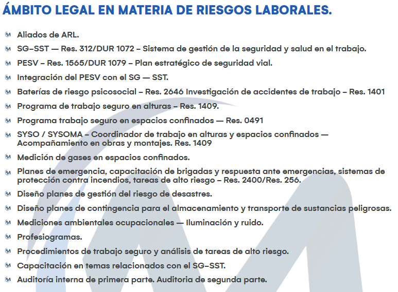 Somos una empresa dedicada a brindar soporte en gestión integral de riesgos, enmarcada en el cumplimiento de los requisitos legales nacionales e internacionales vigentes, respaldados en el conocimiento y la experticia de nuestro talento humano.