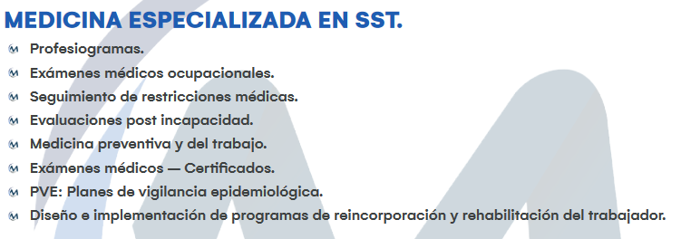 Es una empresa especialista dedicada a la prestación de servicios de asesorías, consultorías, interventorías, auditorias, capacitaciones, en el área de seguridad y salud en el trabajo para satisfacer las necesidades de todo tipo de organización.